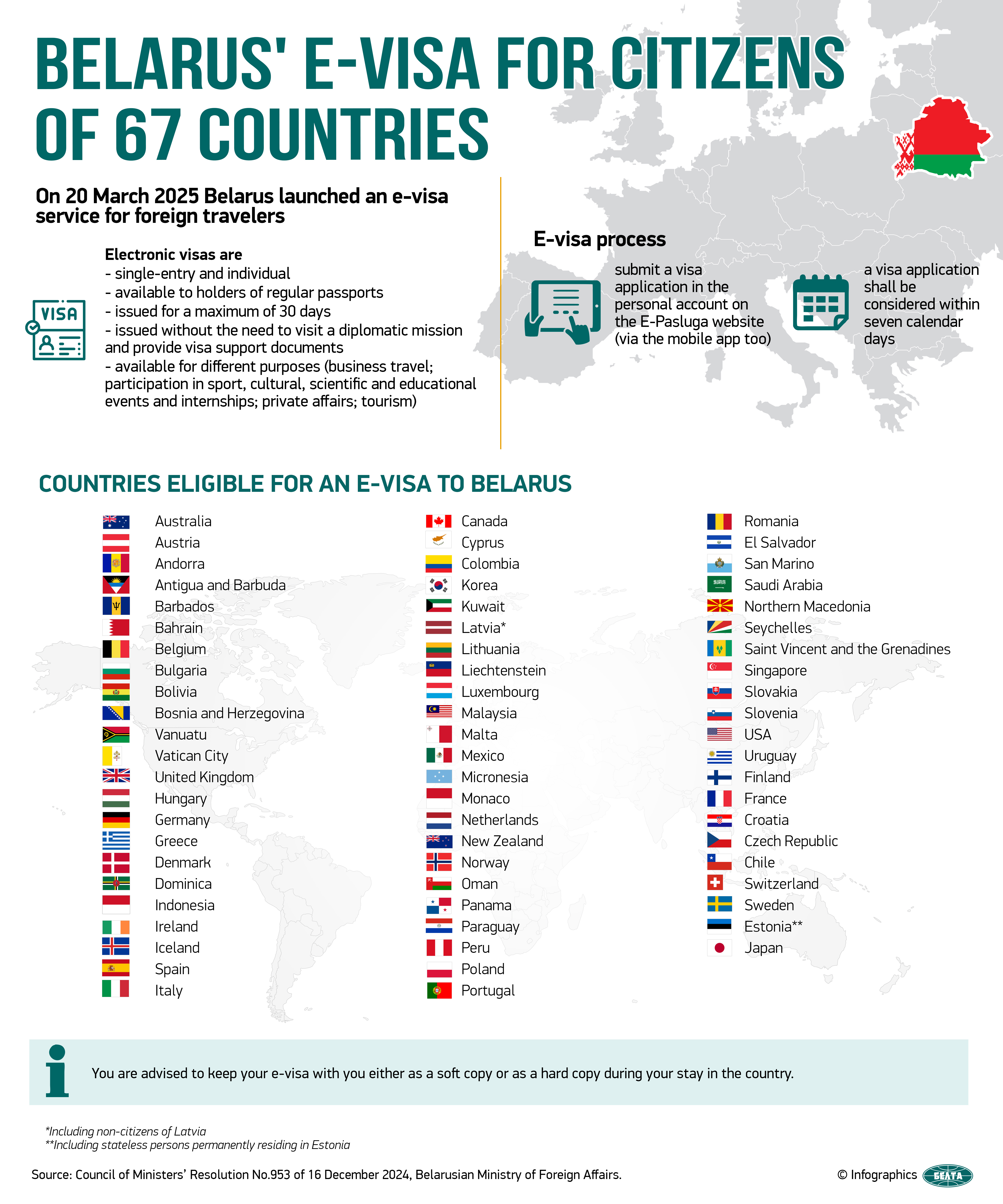 Starting from March 20, 2025 foreign citizens are able to enter Belarus using the E-visa. This possibility is provided by the Government decree as of December 16, 2024 No. 953 amending the Visa regulations of the Republic of Belarus.