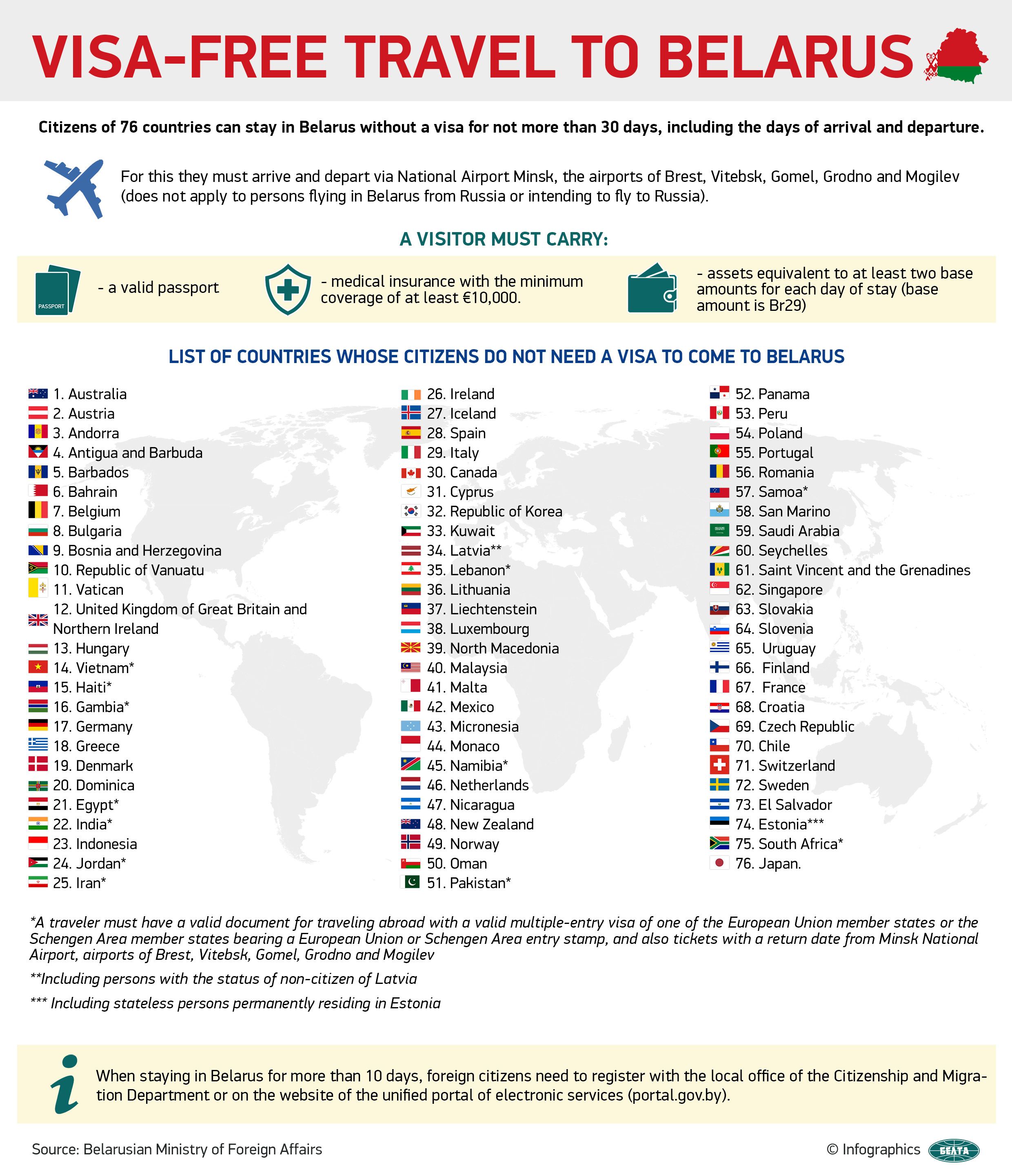 According to the Presidential Decree effective from January 9, 2017 (with changes and additions effective from July 27, 2018 and October 17, 2021) foreign citizens of 76 countries can enter Belarus for up to 30 days* and exit from the territory of Belarus only through the State border checkpoints of the Republic of Belarus "Minsk National Airport", “Airport Brest”, “Airport Gomel”, “Airport Grodno”, “Airport Mogilev”, “Airport Vitebsk”.